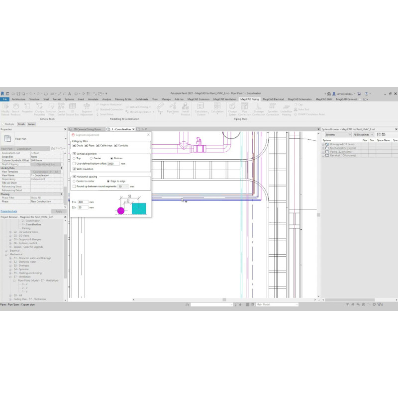 MagiCAD Трубопроводи дозволяє виконувати проектування та розрахунки систем опалення, кондиціювання повітря, водопостачання, каналізації, протипожежних систем та систем газопостачання. Рішення MagiCAD Трубопроводи пропонує зручний функціонал, який допомагає заощадити час проектування систем, а також вбудовані розрахунки, включаючи підбір перерізів та балансування систем.