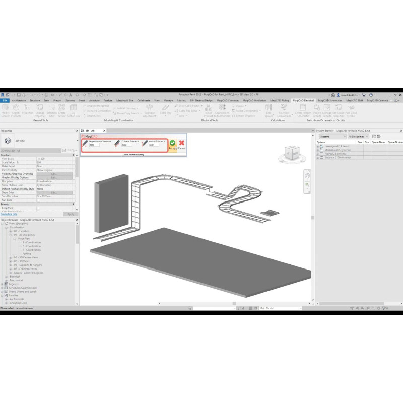 MagiCAD Електропостачання – це сучасне рішення для інформаційного моделювання та створення проектів систем електропостачання, освітлення та слаботочних систем різного рівня, а також формування однолінійних схем. MagiCAD надає користувачам доступ до онлайн бази даних, яка містить великий асортимент електротехнічного обладнання з точними розмірами та всіма необхідними технічними характеристиками. Специфікації обладнання можна створювати як для окремих приміщень або поверхів, так і для будівлі.